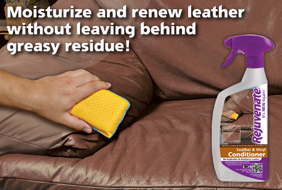 Rejuvenate LEATHER & VINYL Renewer & Conditioner re-hydrates, renews and protects all leather and vinyl surfaces. After cleaning and preparing the surface with Rejuvenate leather cleaner use the conditioner to moisturize and protect your fine leather. Leaves a rich sheen and deep luster without the greasy residue.